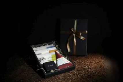 Az elegáns díszdoboz táblás csokoládékat és drazsékat, esetenként bonbonokat is tartalmaz. Az összeállítás tartalma a készlet függvényében változik.
