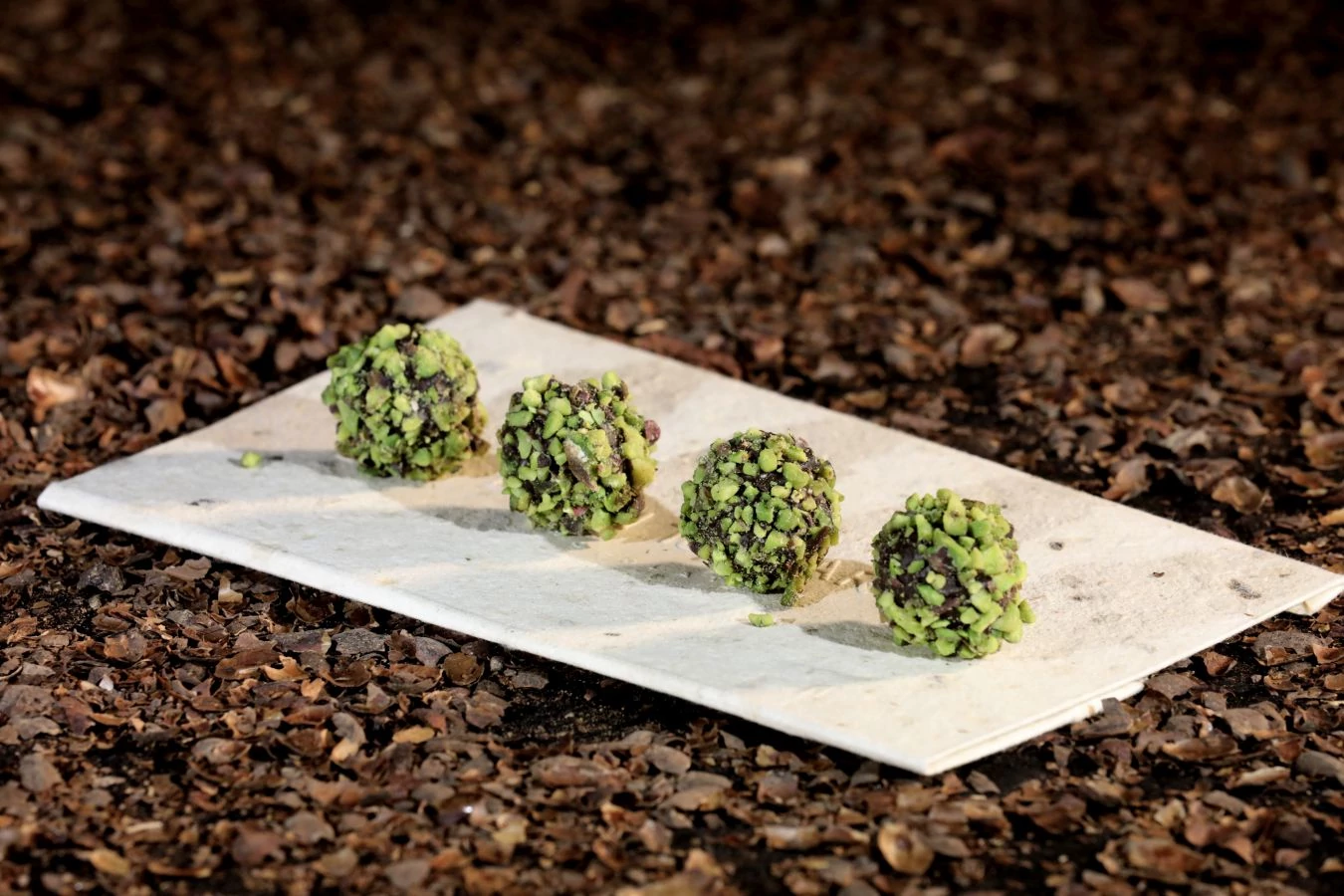 Brontei pisztácia paszta és bean-to-bar fehér csokoládé keverékét töltjük a togói étcsokoládé burokba, majd pisztácia darabkákkal szórjuk meg.