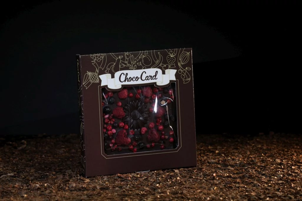 ChocoCard - díszített táblás csokoládé, melynek fedlapjába A6 méretű képeslap csúsztatható.