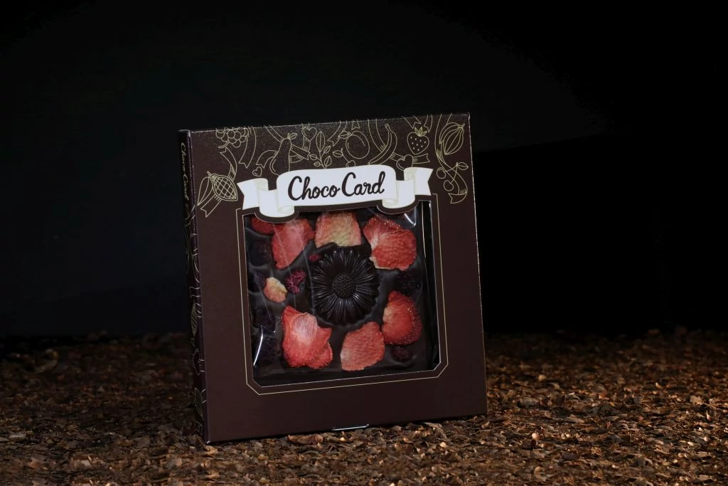 ChocoCard - díszített táblás csokoládé, melynek fedlapjába A6 méretű képeslap csúsztatható.