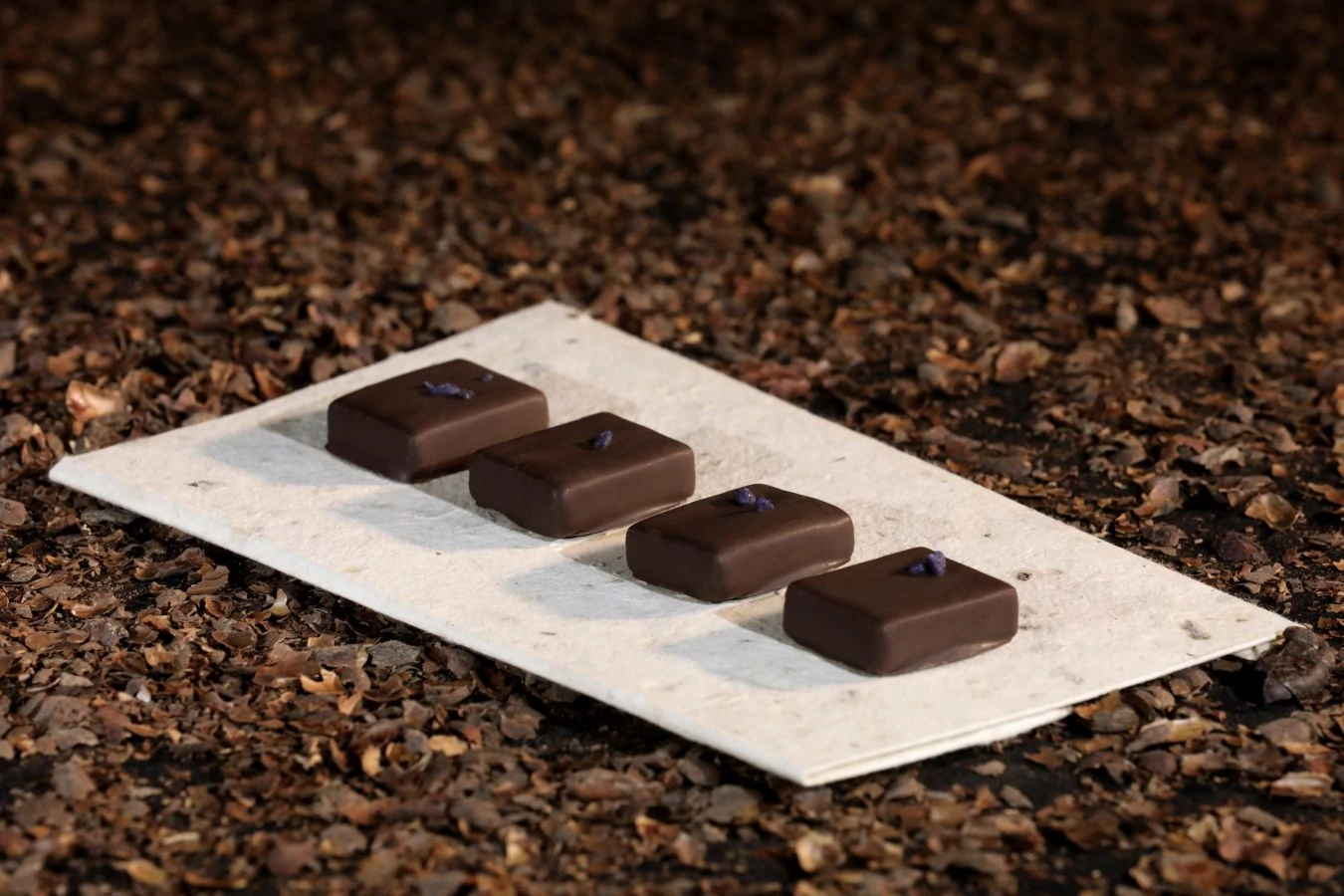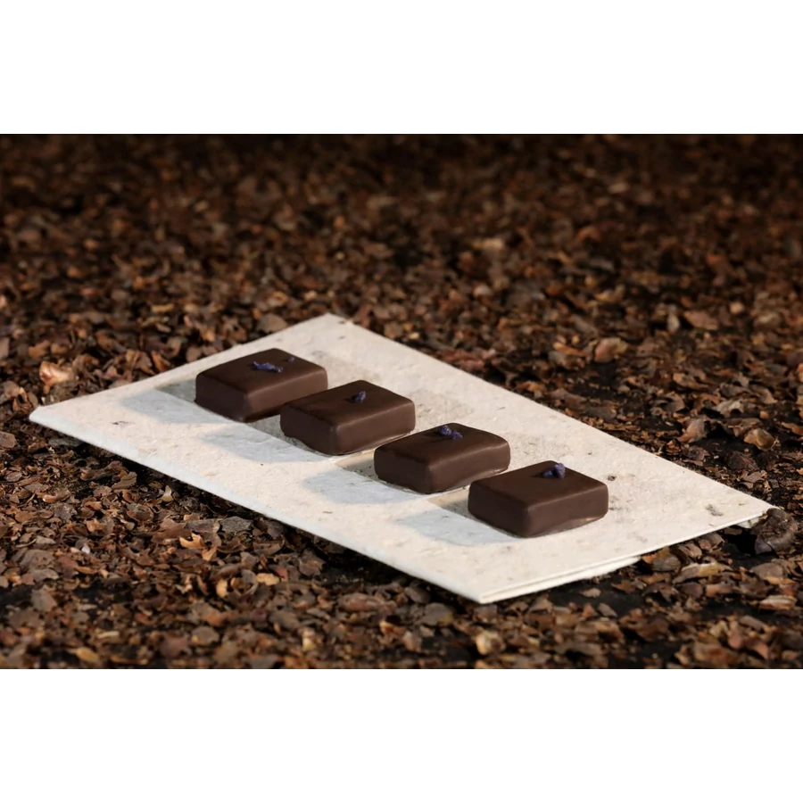Összetevők: tanzán tejcsokoládé 60% (tejport tartalmaz), togói étcsokoládé 72%, tejszín, feketeribizli püré, glükóz szirup, vaj, ibolya esszencia,
