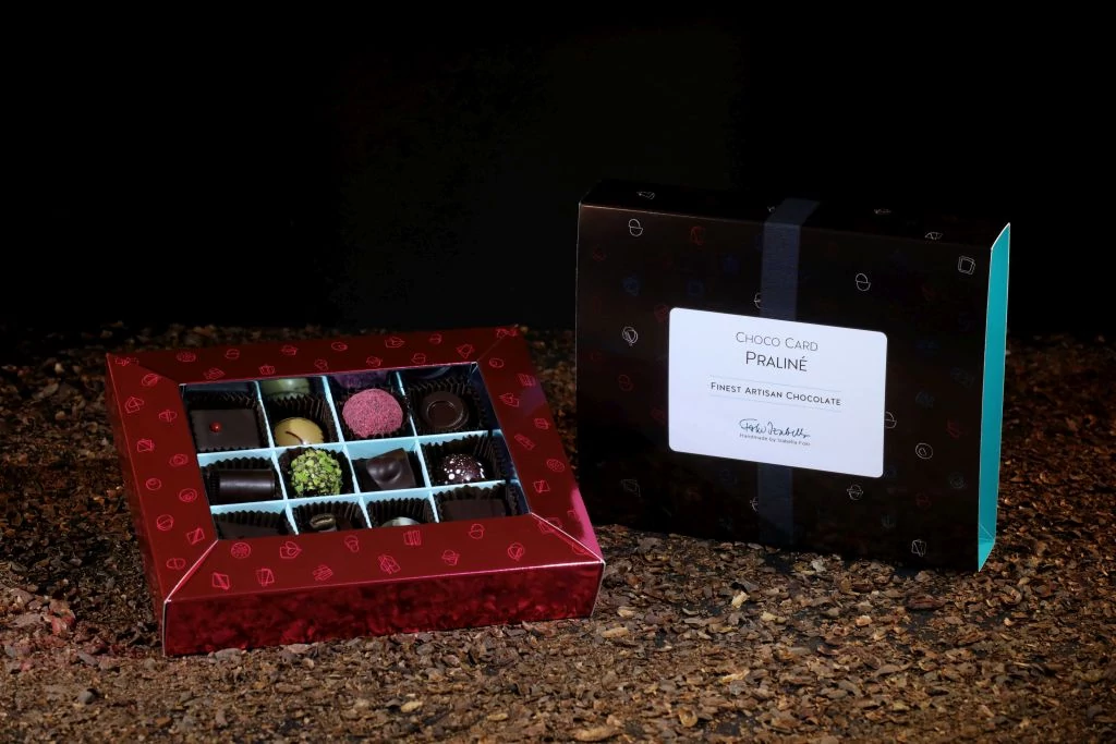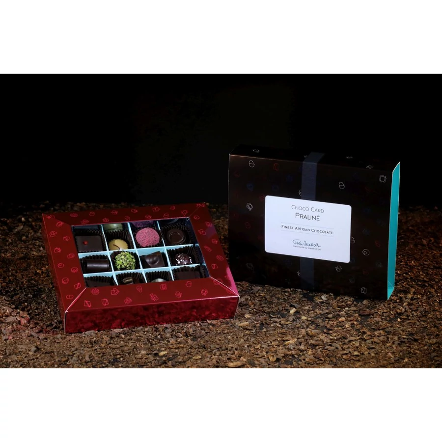 A díszdoboz tizenkét darab friss bonbont tartalmaz.